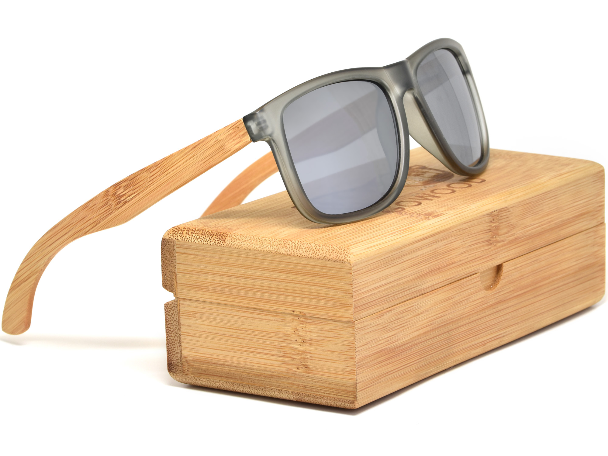 Published May 10, 2019 at 2000 × 1500 in Lunettes de soleil carrées en bois de bambou avec monture givrée grise et verres miroir argent polarisés