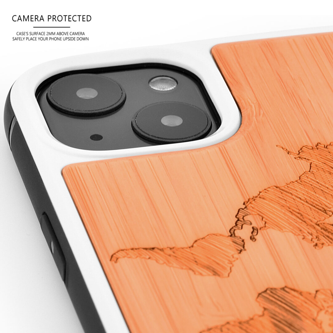 Bamboo wood phone cases for iPhone 13 with world map print – camera Published April 5, 2022 at 1500 × 1500 in iPhone 13 zebra wood case with TPU bumper and white PC ← Previous Next →