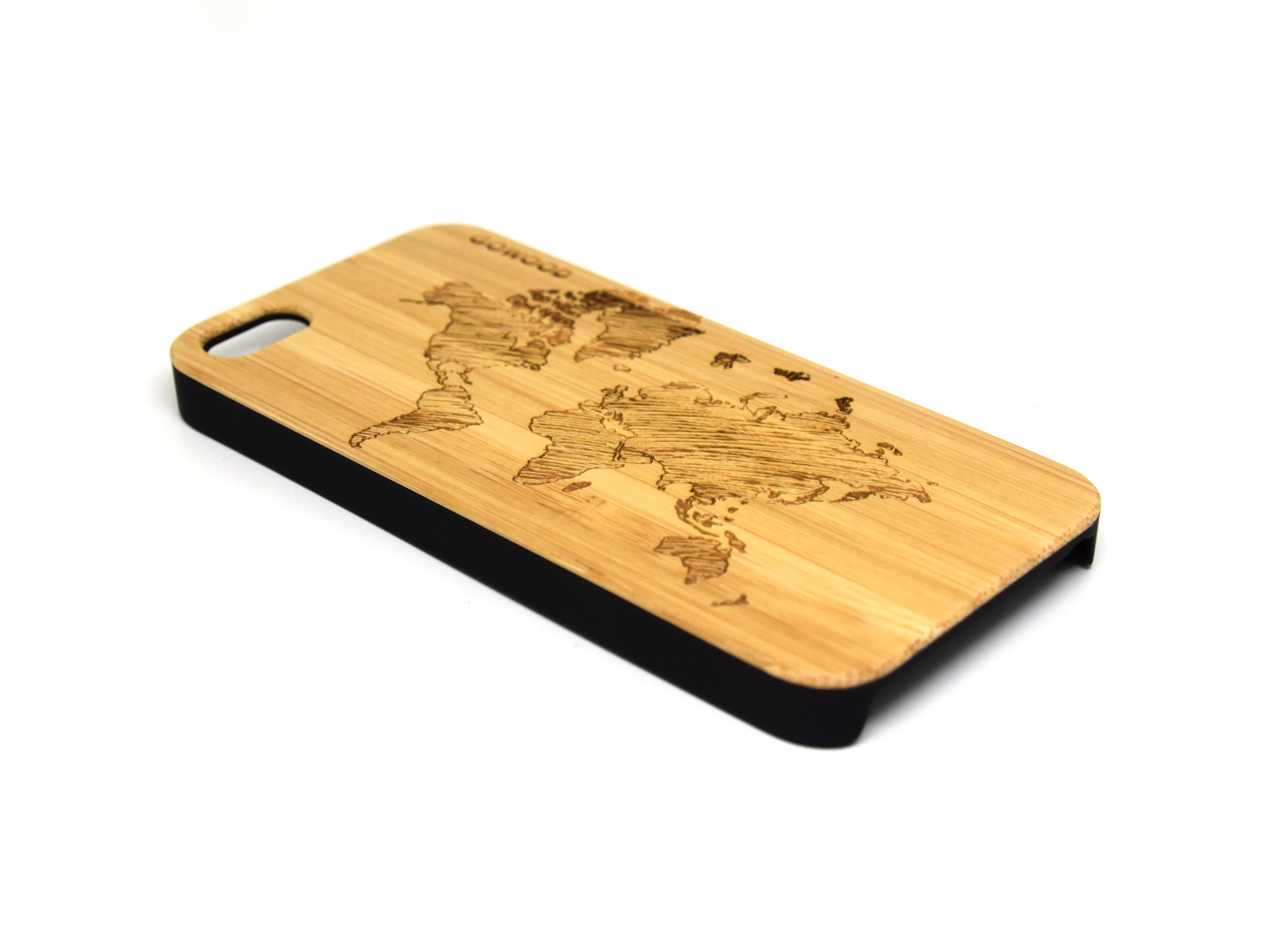 iphone5-PC-worldmap-angle-left Published November 29, 2015 at 2500 × 1875 in Étui iPhone 5 en bois et côtés en polycarbonate – bambou avec gravure carte du monde