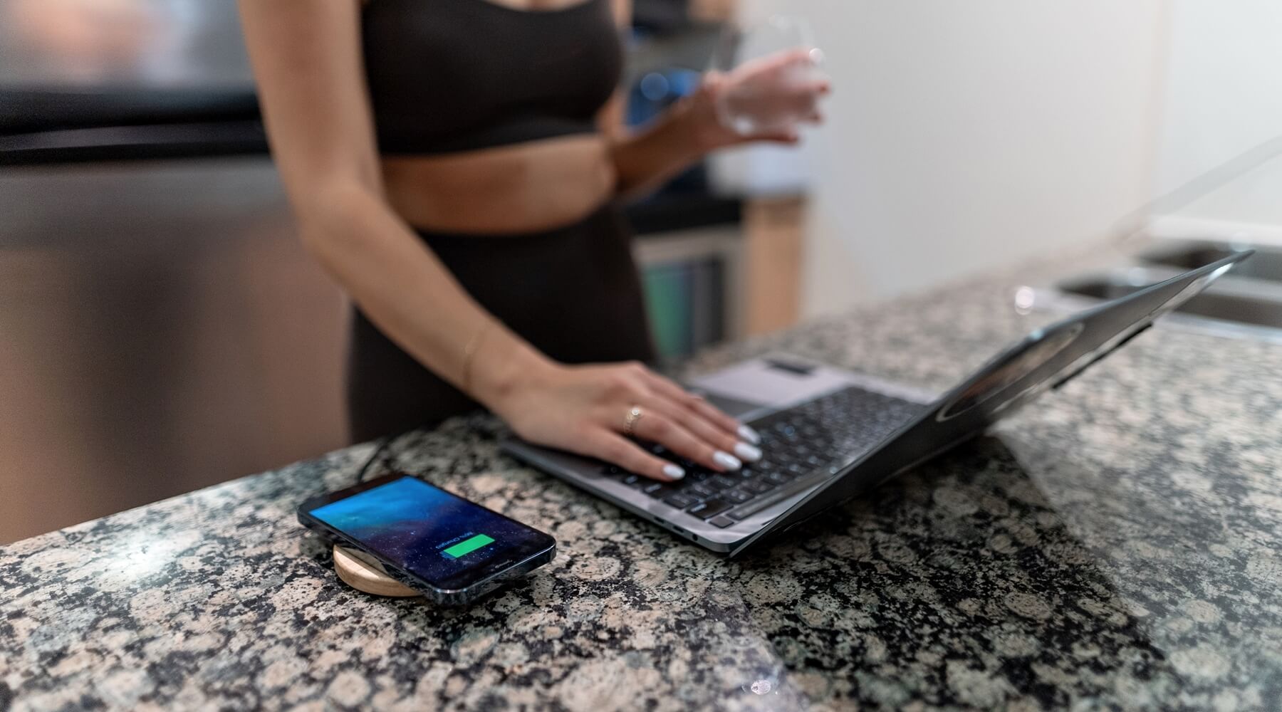 A young woman standing near a wooden wireless charger, working on her laptop Published September 7, 2024 at 1800 × 1000 in Does Wireless Charging Harm Smartphone Batteries? ← Previous Next →