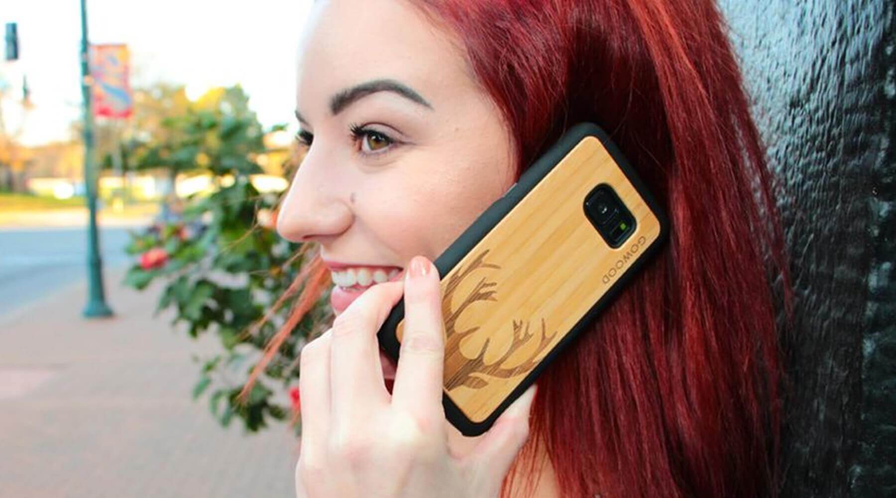 young lady with red hair talking on her phone with a Gowood wooden phone case on it (1) Published September 27, 2023 at 1800 × 1000 in Why Wooden Accessories are Better Than Plastic Next →