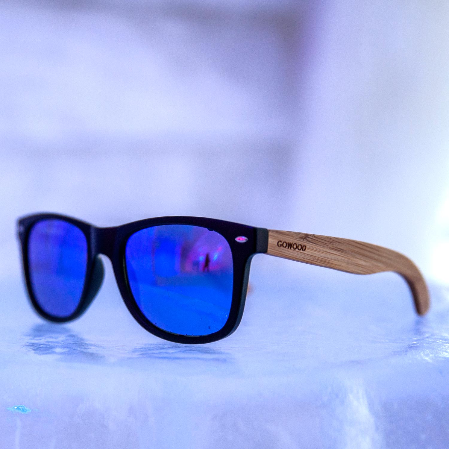 Bamboo wood wayfarer sunglasses blue lenses indoors