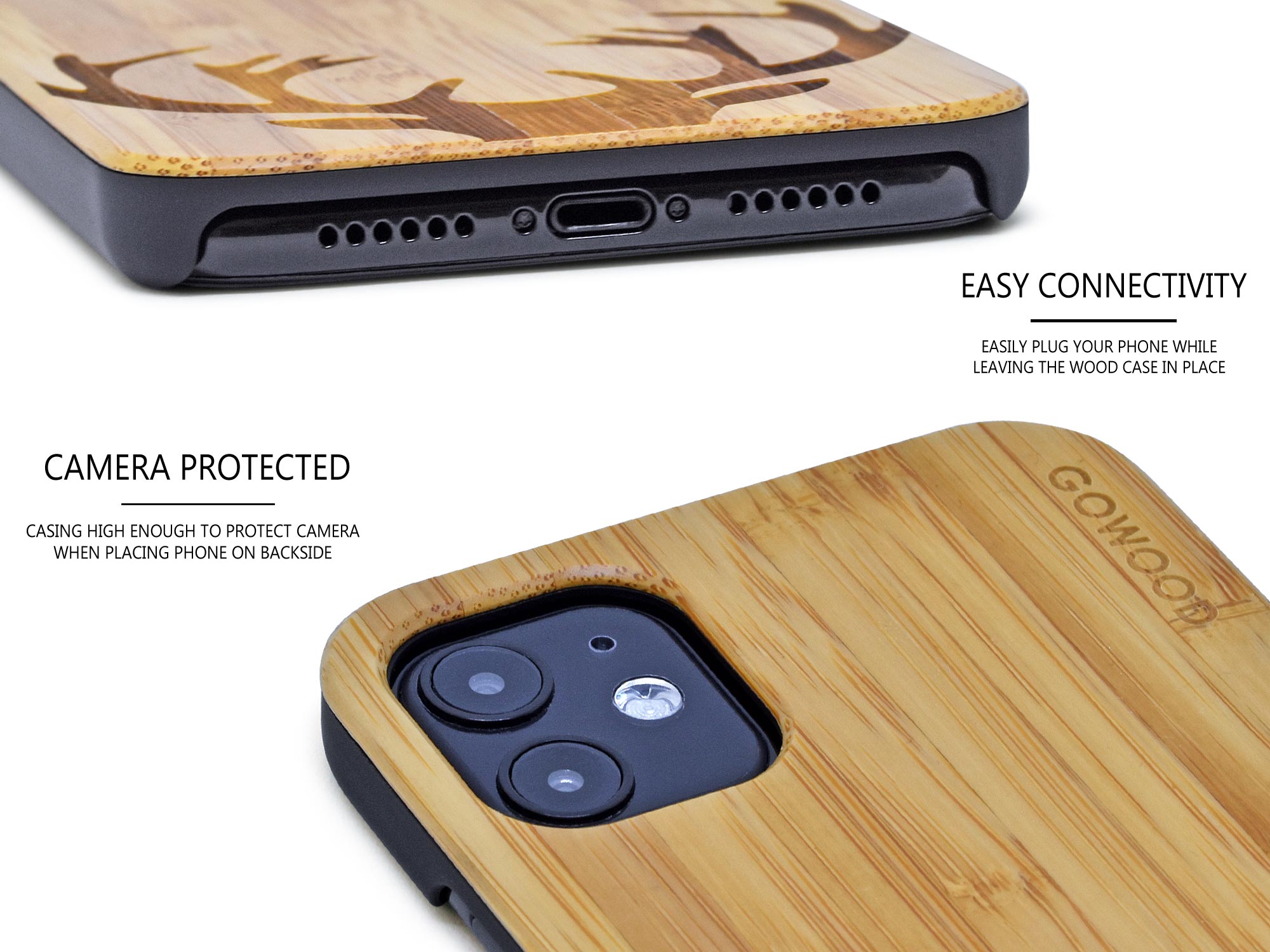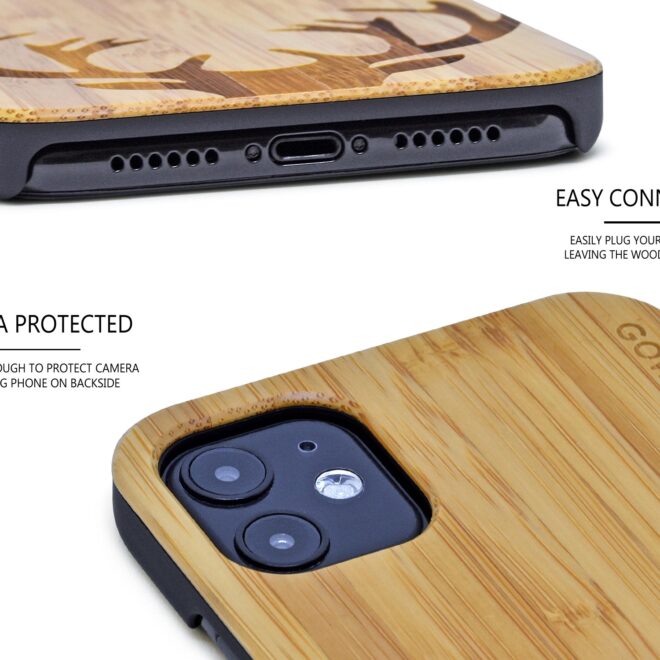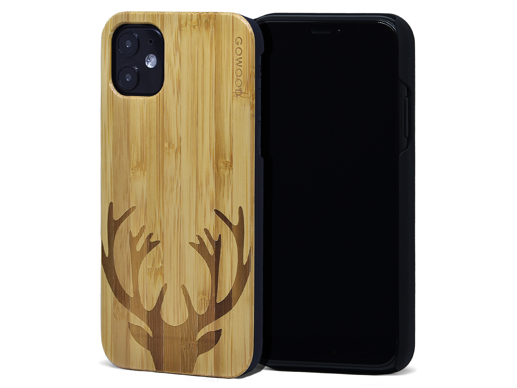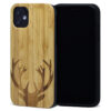 Étui iPhone 11 en bois avec côtés en polycarbonate aux propriétés anti-chocs, bois de bambou véritable au dos de l’étui avec magnifique gravure d’un chevreuil et intérieur en polycarbonate