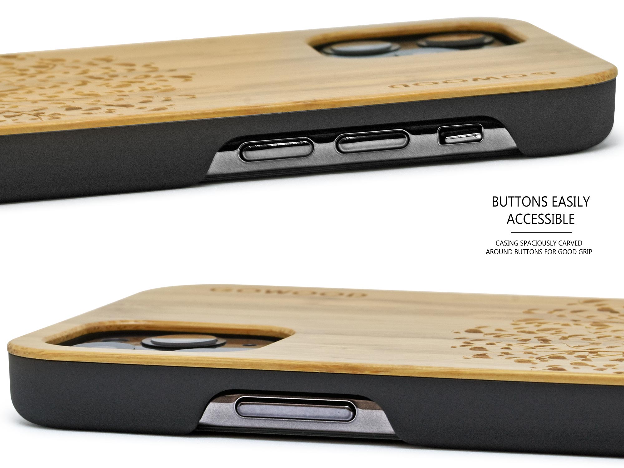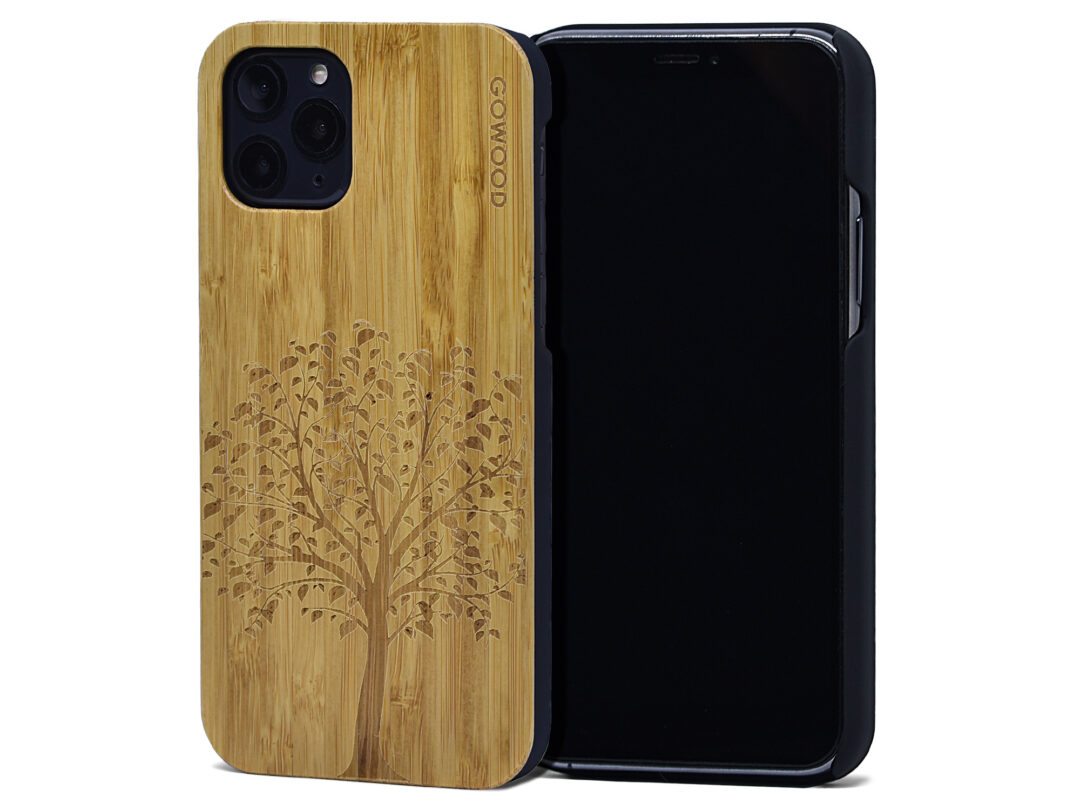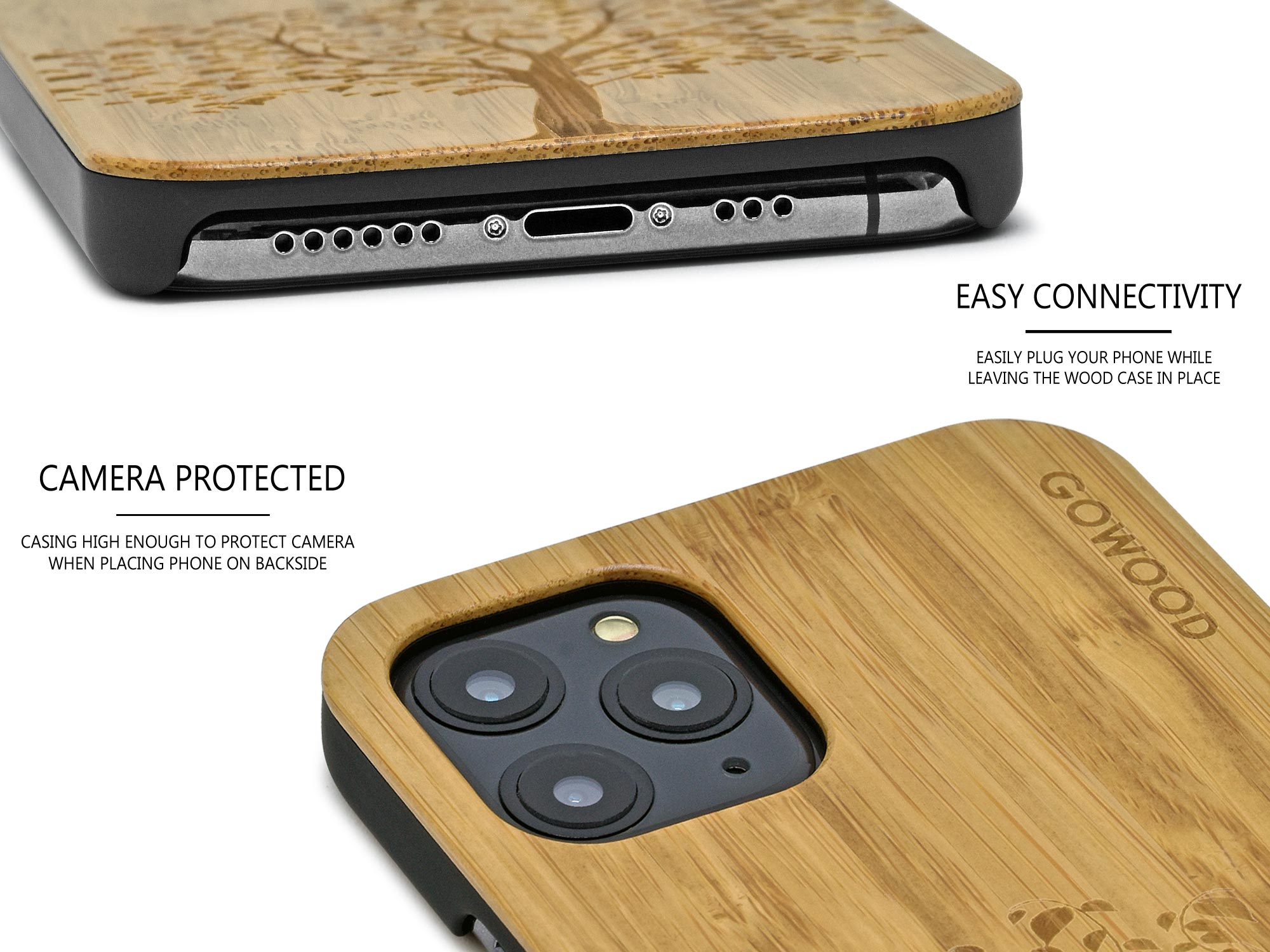 Étui iPhone 11 Pro en bois avec côtés en polycarbonate aux propriétés anti-chocs, bois de bambou véritable avec magnifique gravure d’un arbre au dos de l’étui et intérieur en polycarbonate