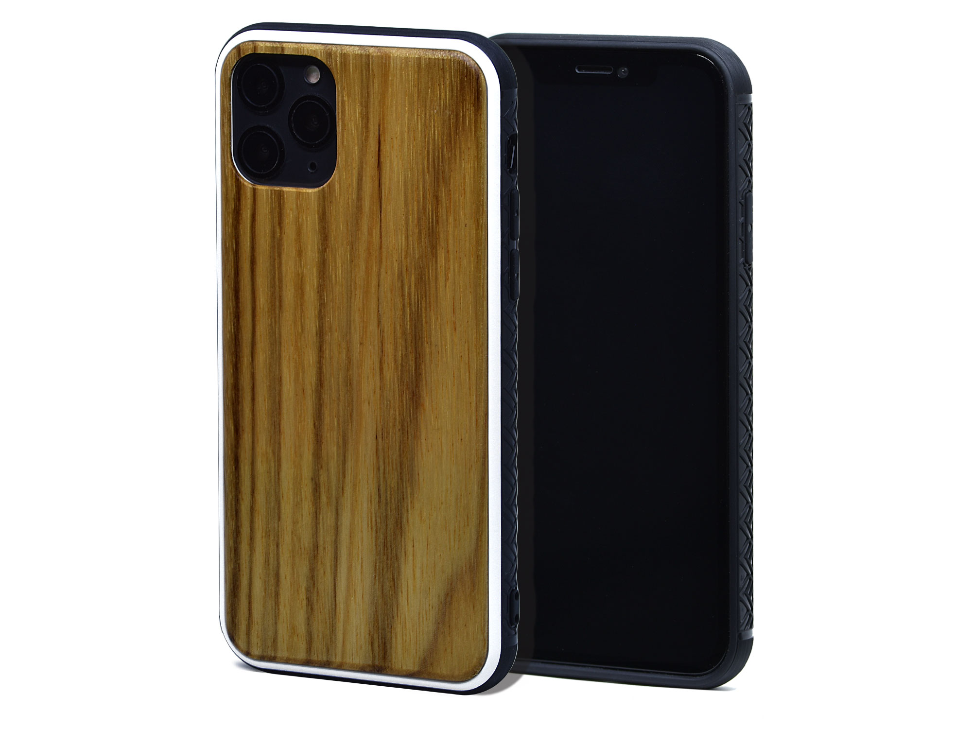Étui iPhone 11 Pro en bois avec côtés anti-dérapant en TPU aux propriétés anti-chocs, bois de noyer véritable au dos de l’étui et intérieur en polycarbonate
