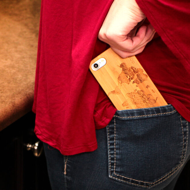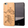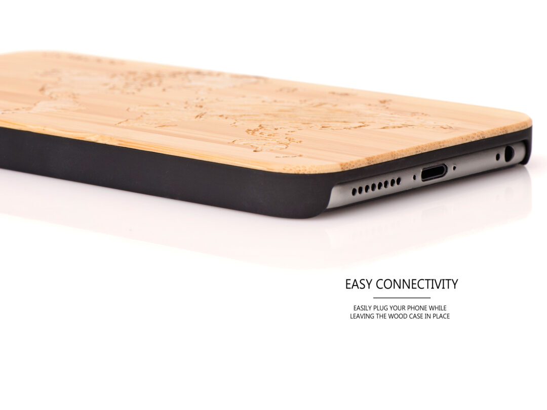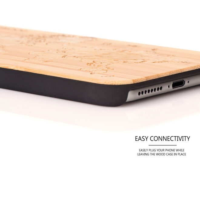 - Dos de l’étui entièrement fabriqué en bambou naturel et gravé d’une magnifique cart du monde