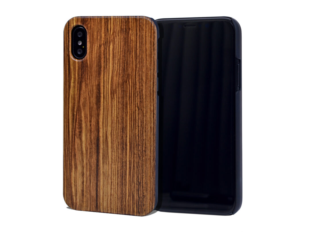 Étui iPhone X et XS en bois avec côtés en polycarbonate aux propriétés anti-chocs, bois de zèbre véritable au dos de l’étui et intérieur en polycarbonate
