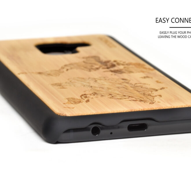 Étui Samsung Galaxy A8 en bois et côtés en polycarbonate – bambou avec gravure carte du monde
