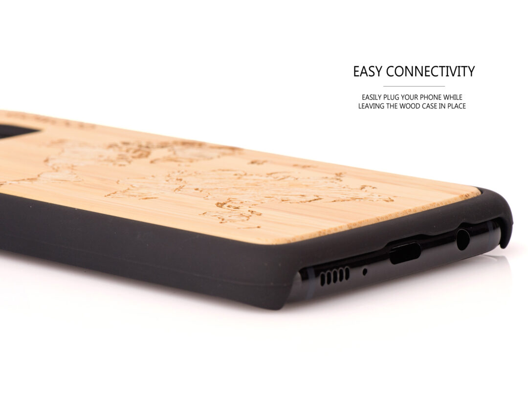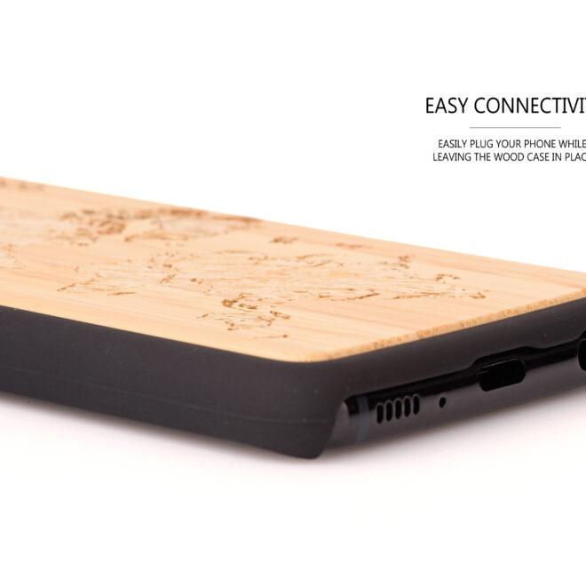 - Dos de l’étui entièrement fabriqué en bambou naturel et gravé d’une magnifique carte du monde