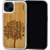 iPhone 13 Mini bamboo wood case with shock absorbing anti-slip TPU bumper, tree engraved real bamboo wood backside with polycarbonate layer inside