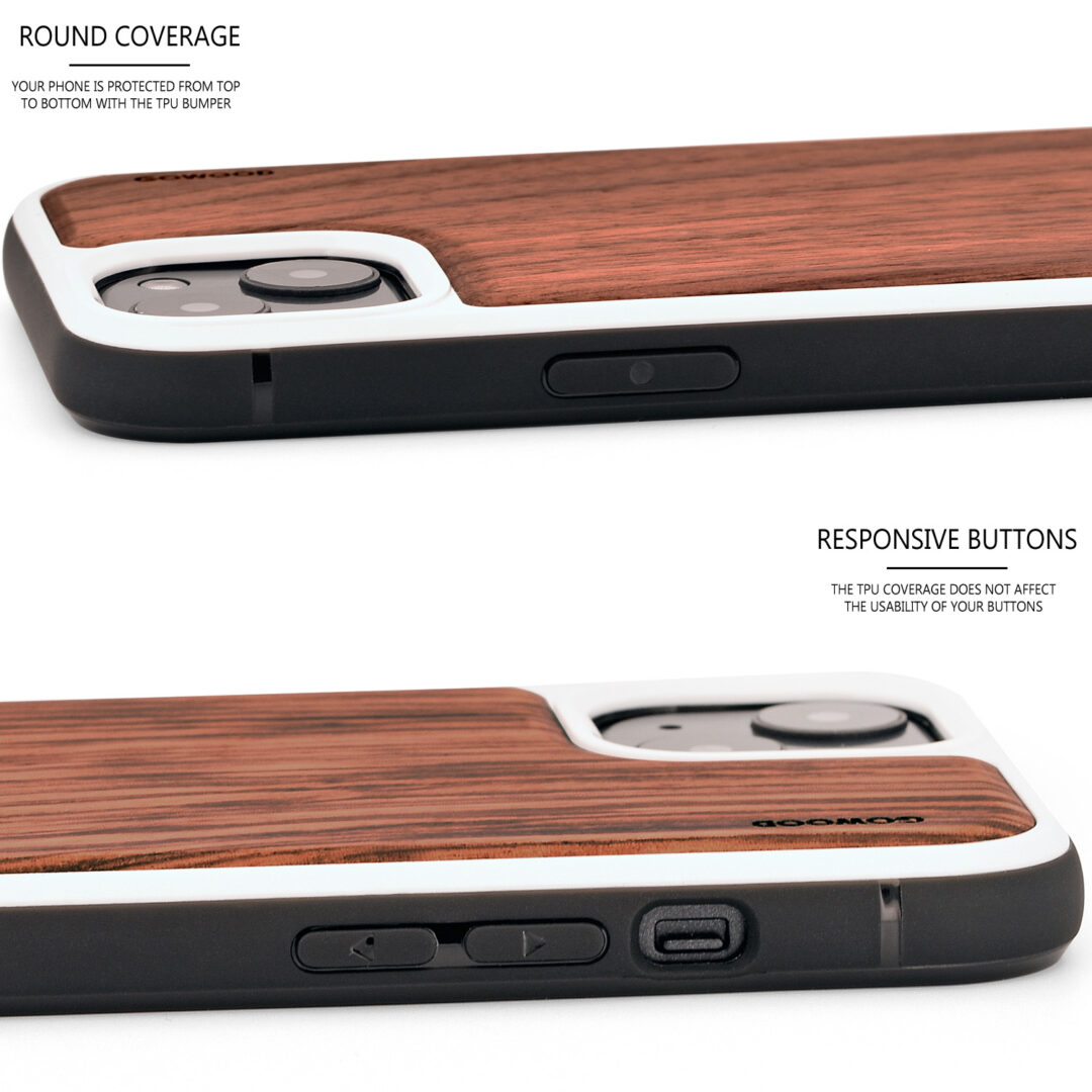iPhone 13 Mini walnut wood case with shock absorbing anti-slip TPU bumper, real walnut wood backside with white polycarbonate layer inside