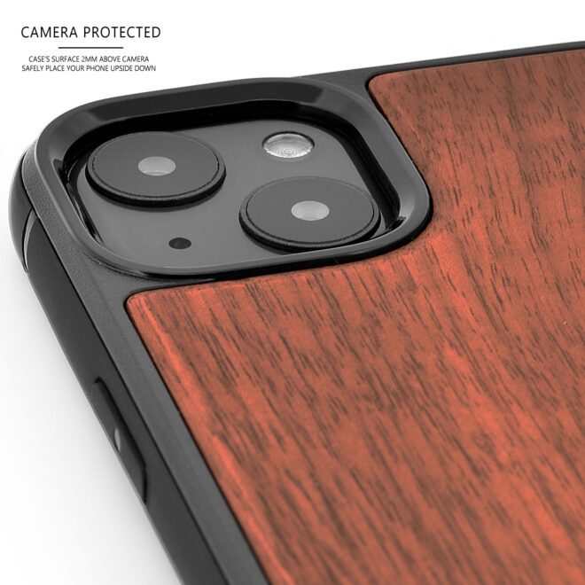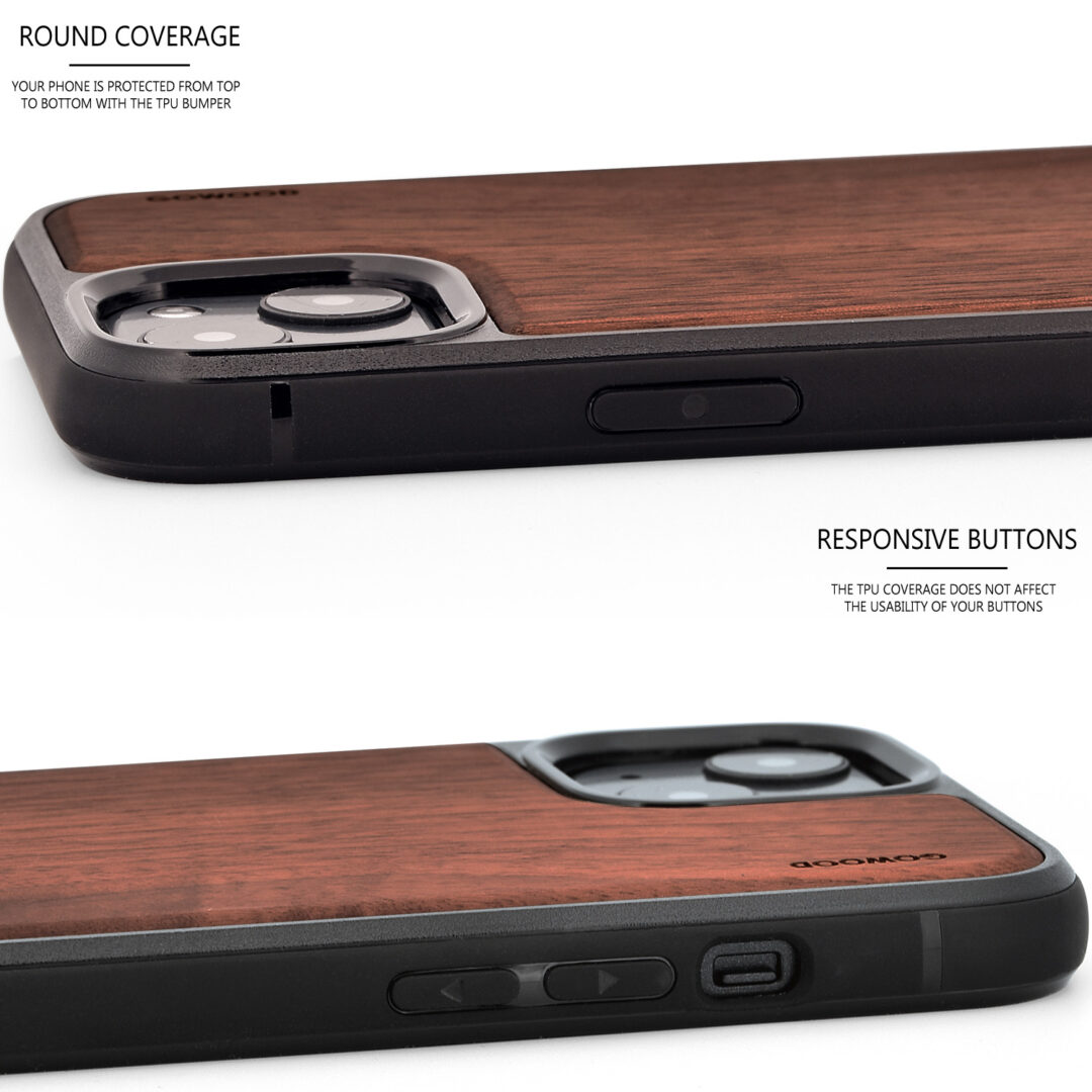 iPhone 13 Mini walnut wood case with shock absorbing anti-slip TPU bumper, real walnut wood backside with black polycarbonate layer inside