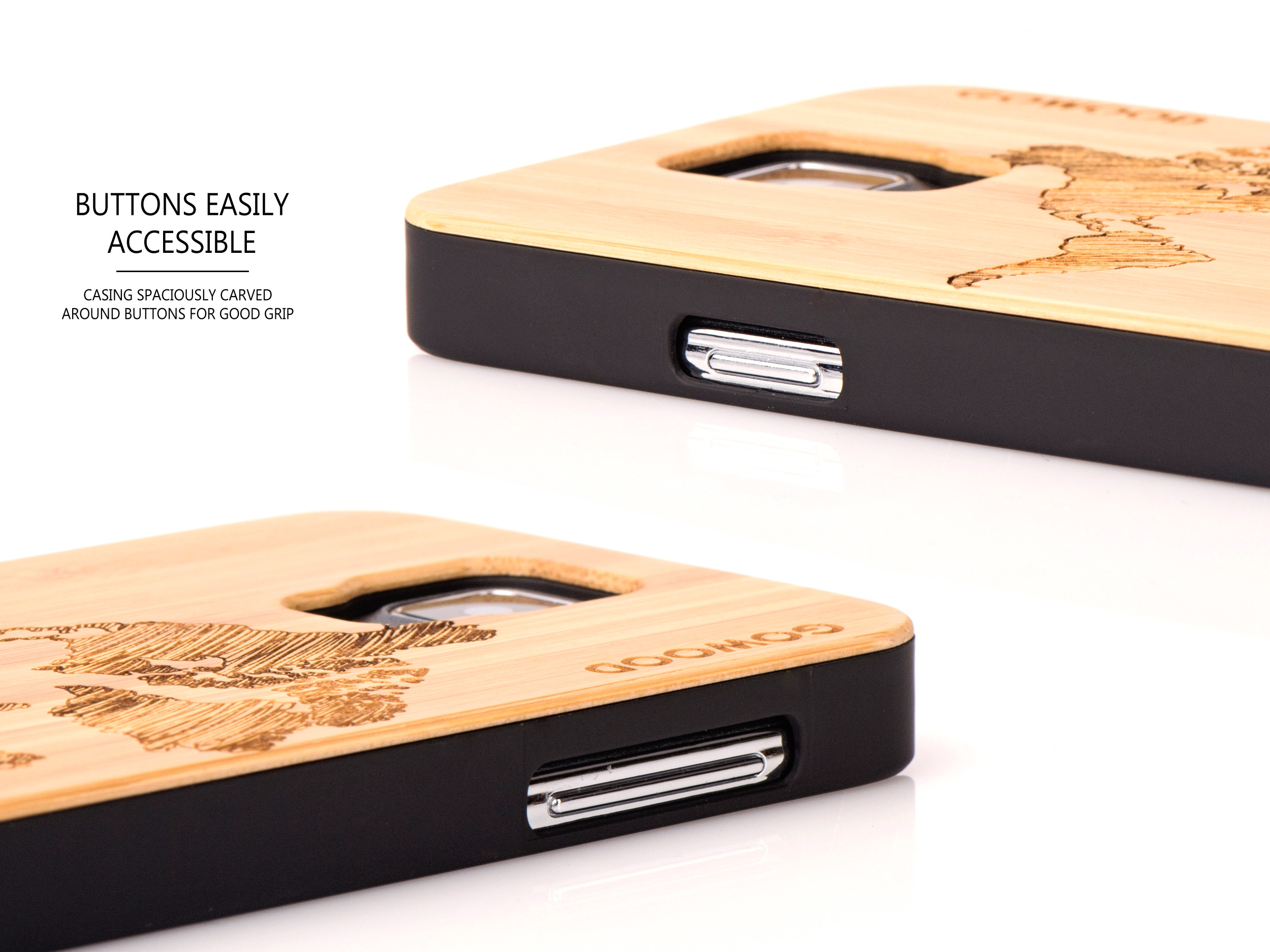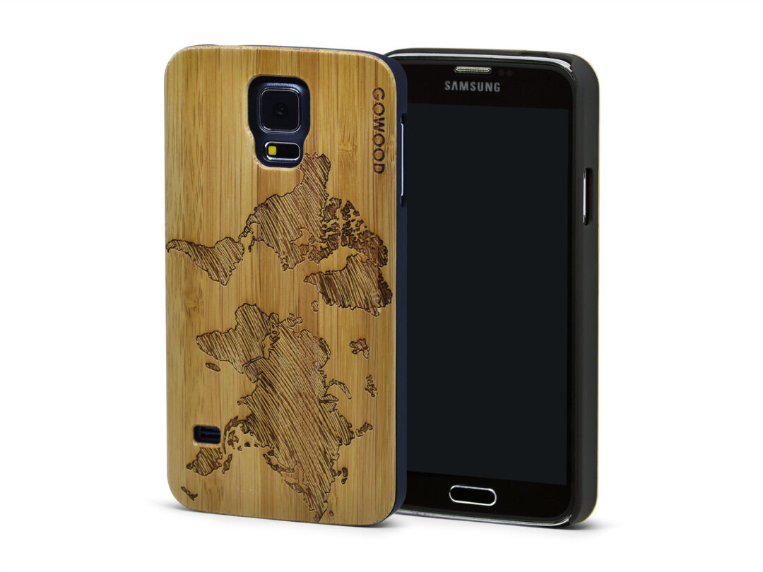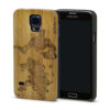 - Dos de l’étui Samsung Galaxy S5 en bois gravé avec un design magnifique de la carte du monde