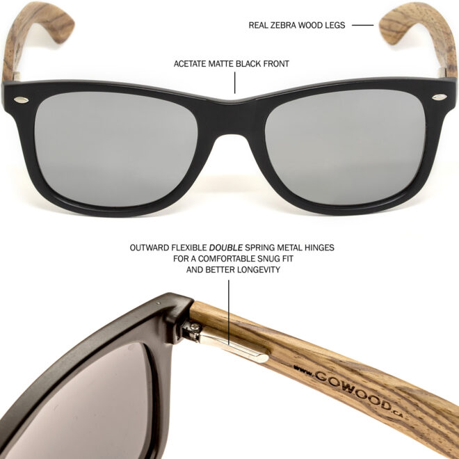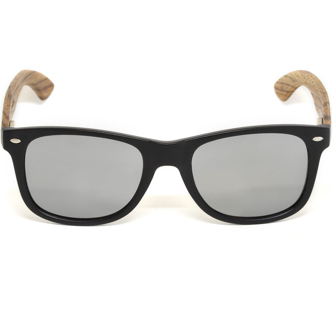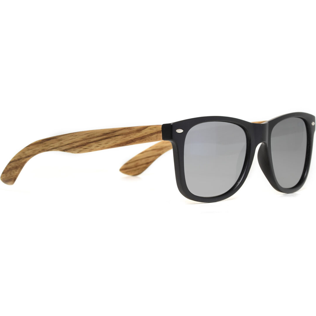 Lunettes de soleil en bois de zèbre de style classique avec devant en polycarbonate de couleur noir mat et verres miroir argent polarisés