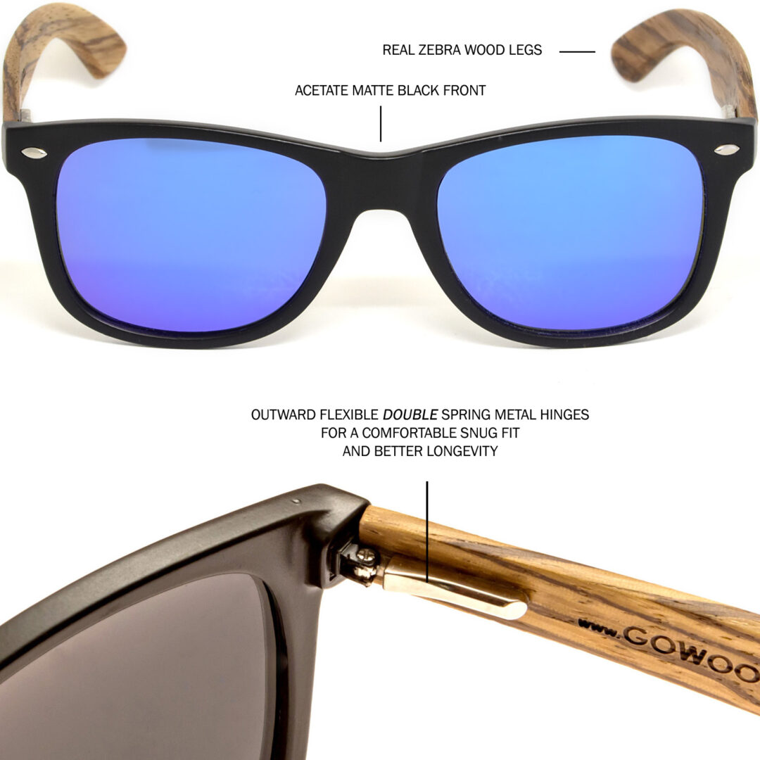 Lunettes de soleil en bois de zèbre de style classique avec devant en polycarbonate de couleur noir mat et verres miroir bleu polarisés