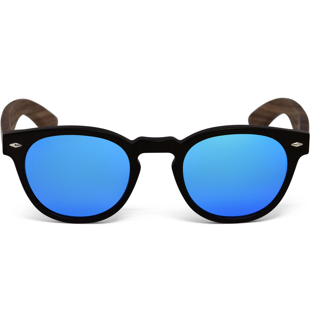 Lunettes de soleil rondes en bois de noyer avec verres miroir bleu polarisés et monture en acétate noir mat