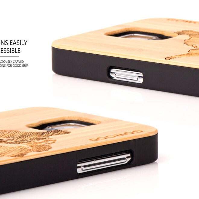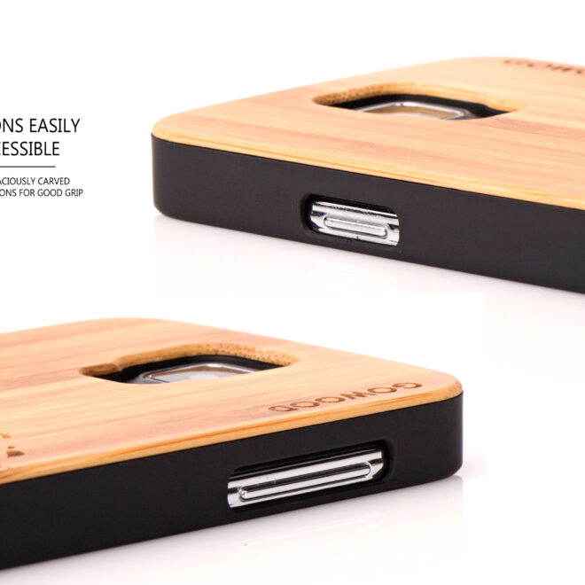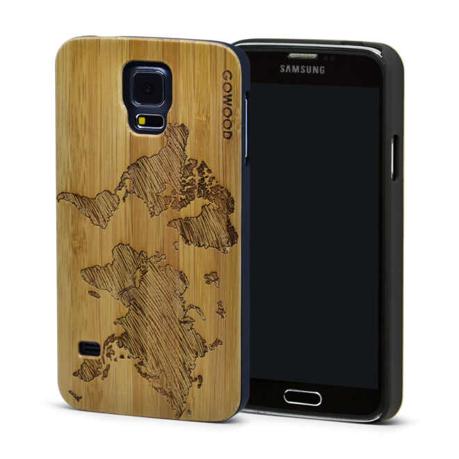 We offer Samsung Galaxy S5 wood cases made of a combination of wood and polycarbonate. Our Samsung Galaxy S5 cases are made of bamboo or walnut wood. All bamboo wood cases have beautiful engravings on the back. The strong shock absorbing polycarbonate acts as a bumper and protects your phone if it drops.