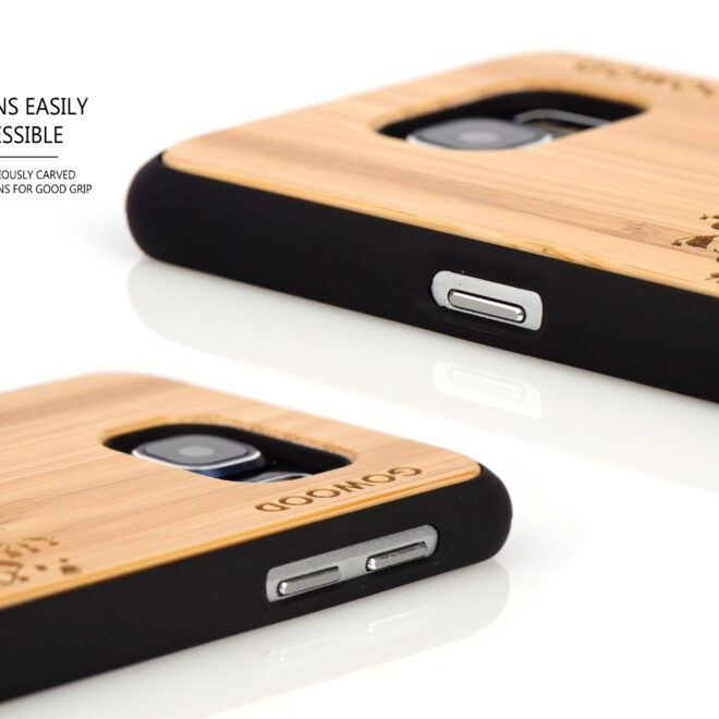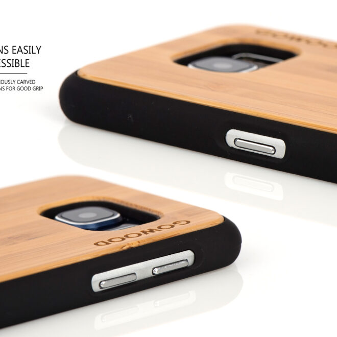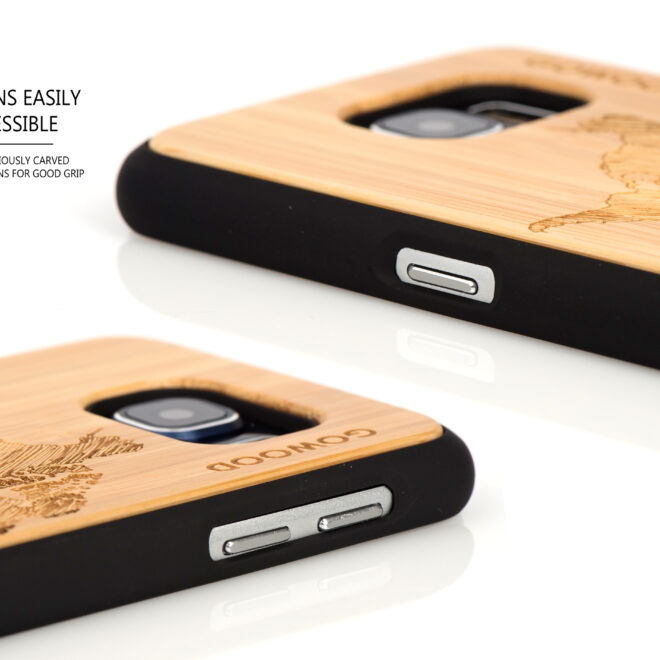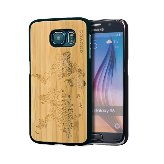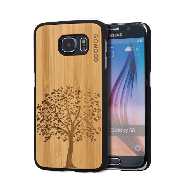 We offer Samsung Galaxy S6 wood cases made of a combination of wood and polycarbonate. Our Samsung Galaxy S6 cases are made of bamboo or walnut wood. All bamboo wood cases have beautiful engravings on the back. The strong shock absorbing polycarbonate acts as a bumper and protects your phone if it drops.
