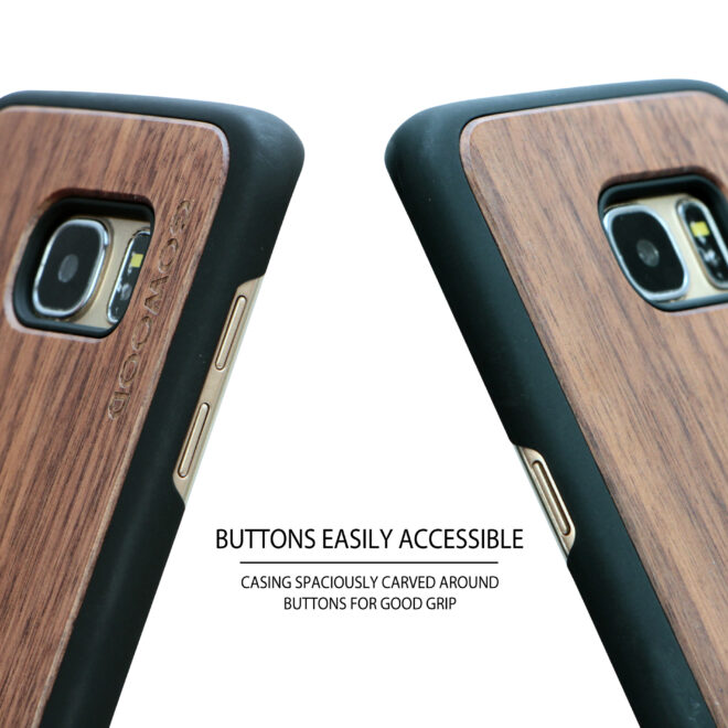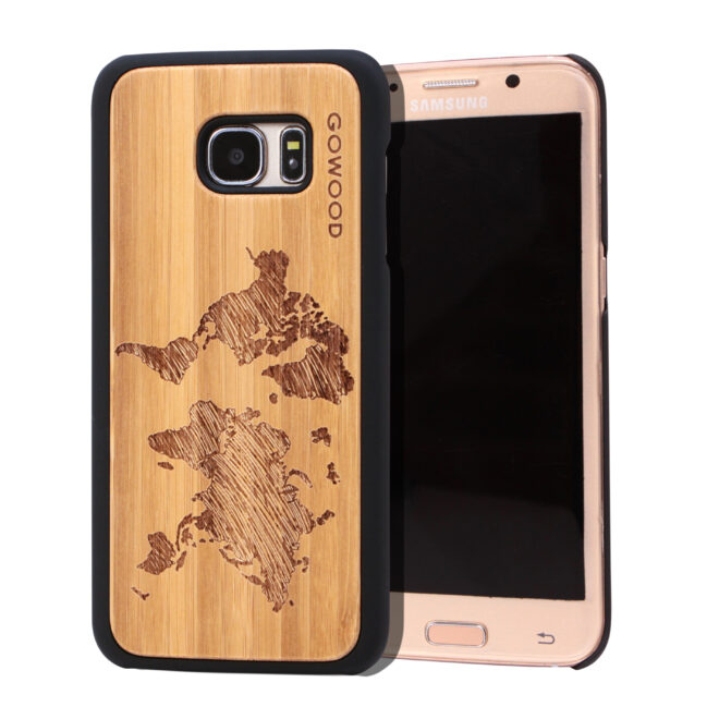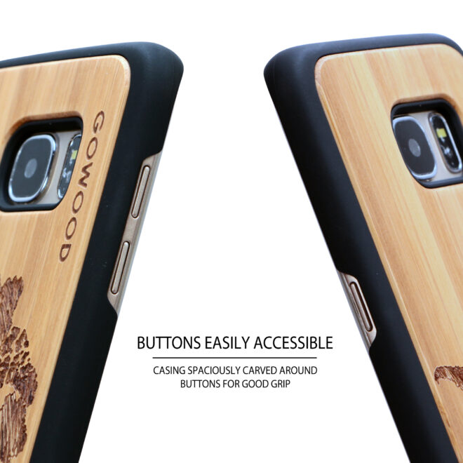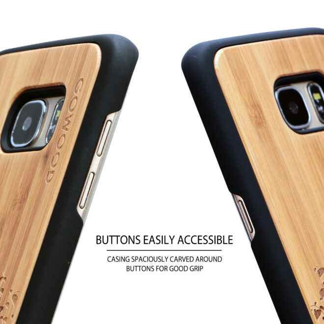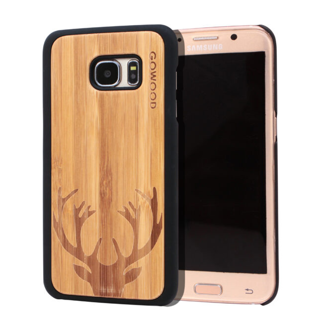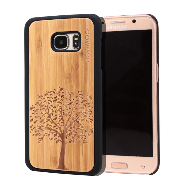 We offer Samsung Galaxy S7 Edge wood cases made of a combination of wood and polycarbonate. Our Samsung Galaxy S7 Edge cases are made of bamboo or walnut wood. All bamboo wood cases have beautiful engravings on the back. The strong shock absorbing polycarbonate acts as a bumper and protects your phone if it drops.