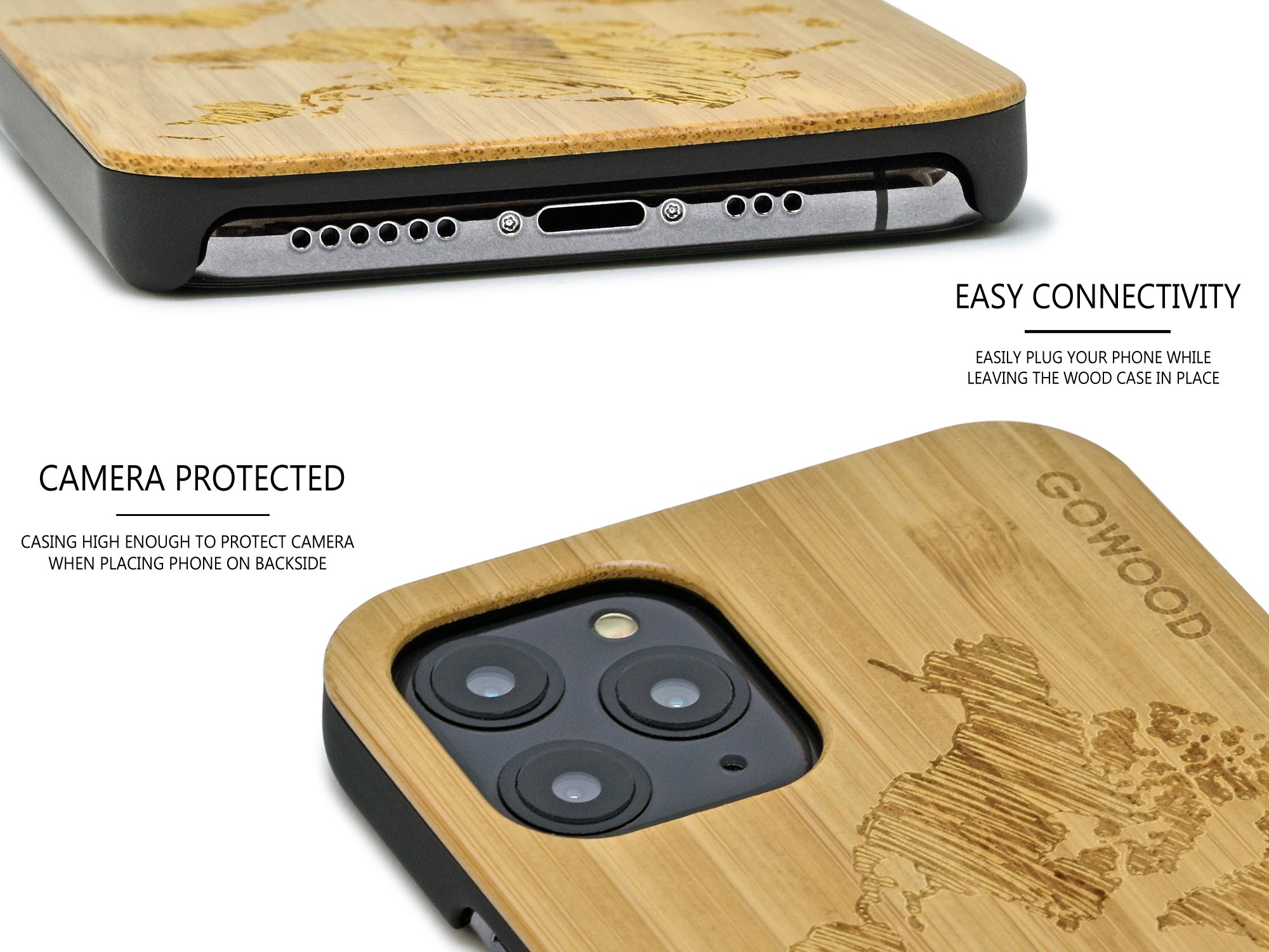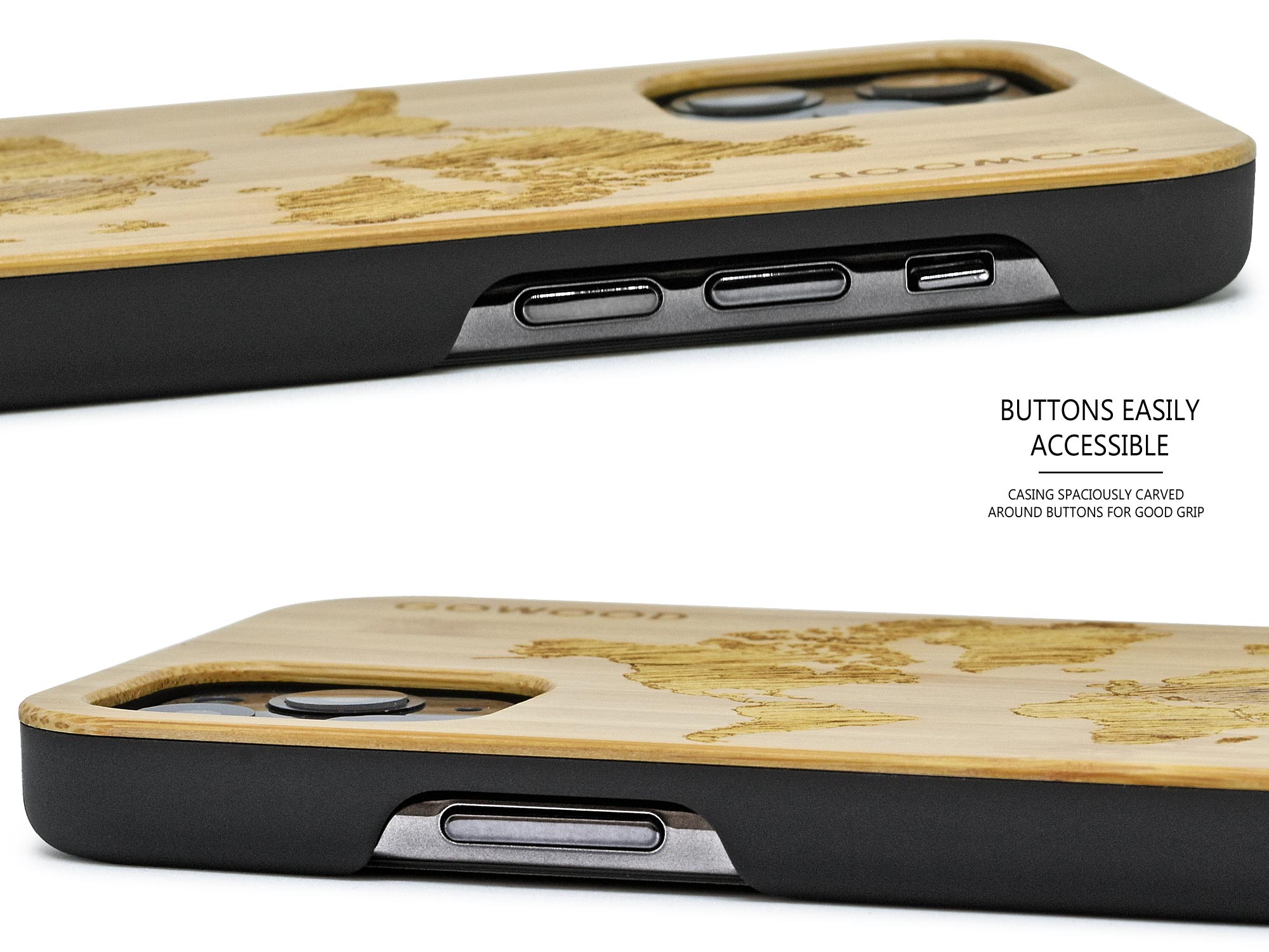 iPhone 11 Pro wood case with shock absorbing polycarbonate bumper and world map engraved bamboo backside