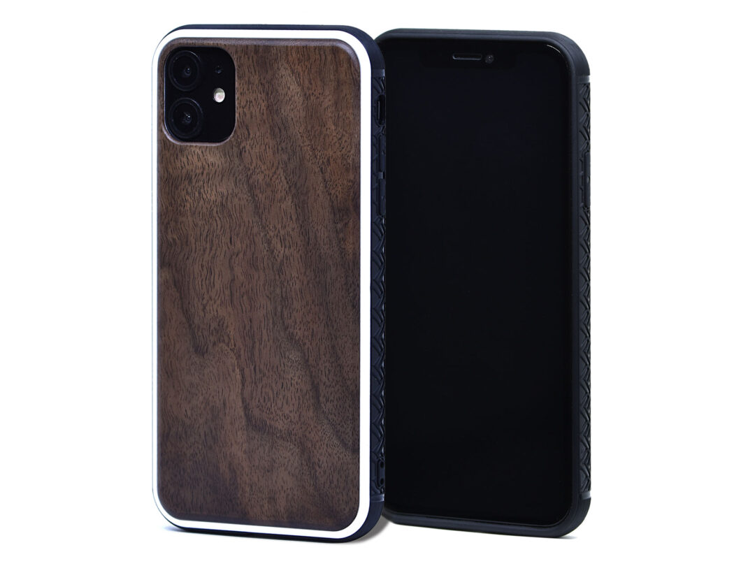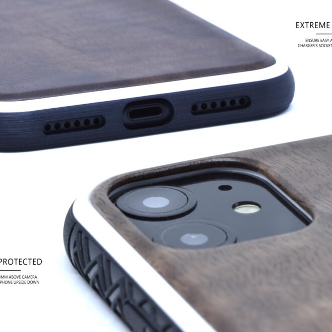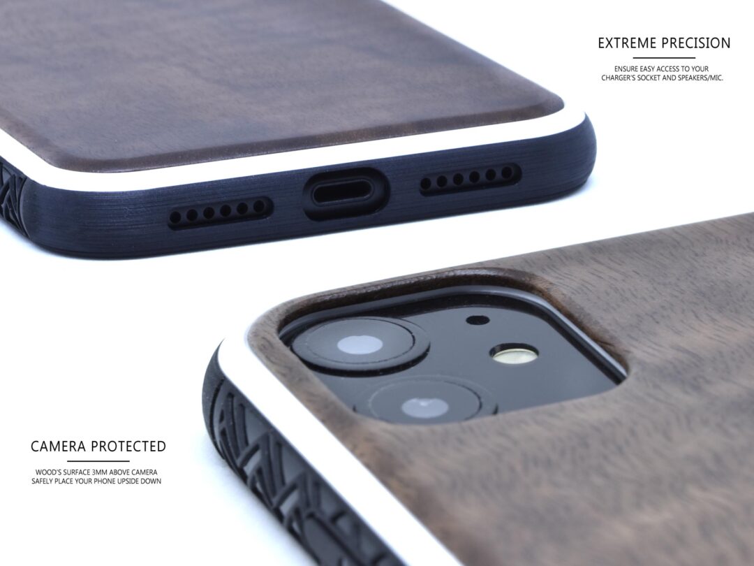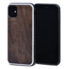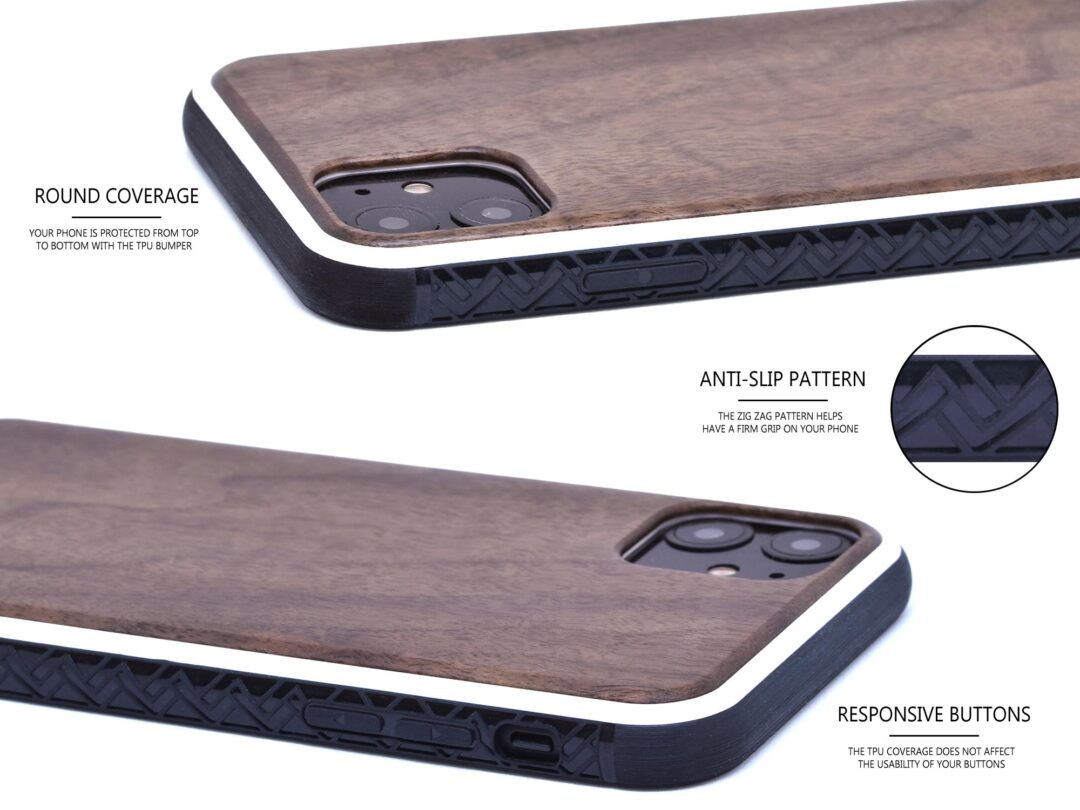 iPhone 11 wood case with shock absorbing anti-slip TPU bumper, real walnut wood backside with polycarbonate layer inside