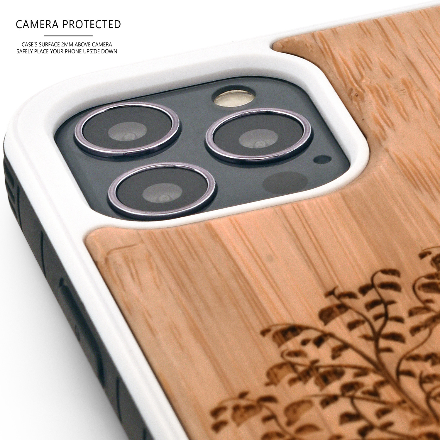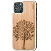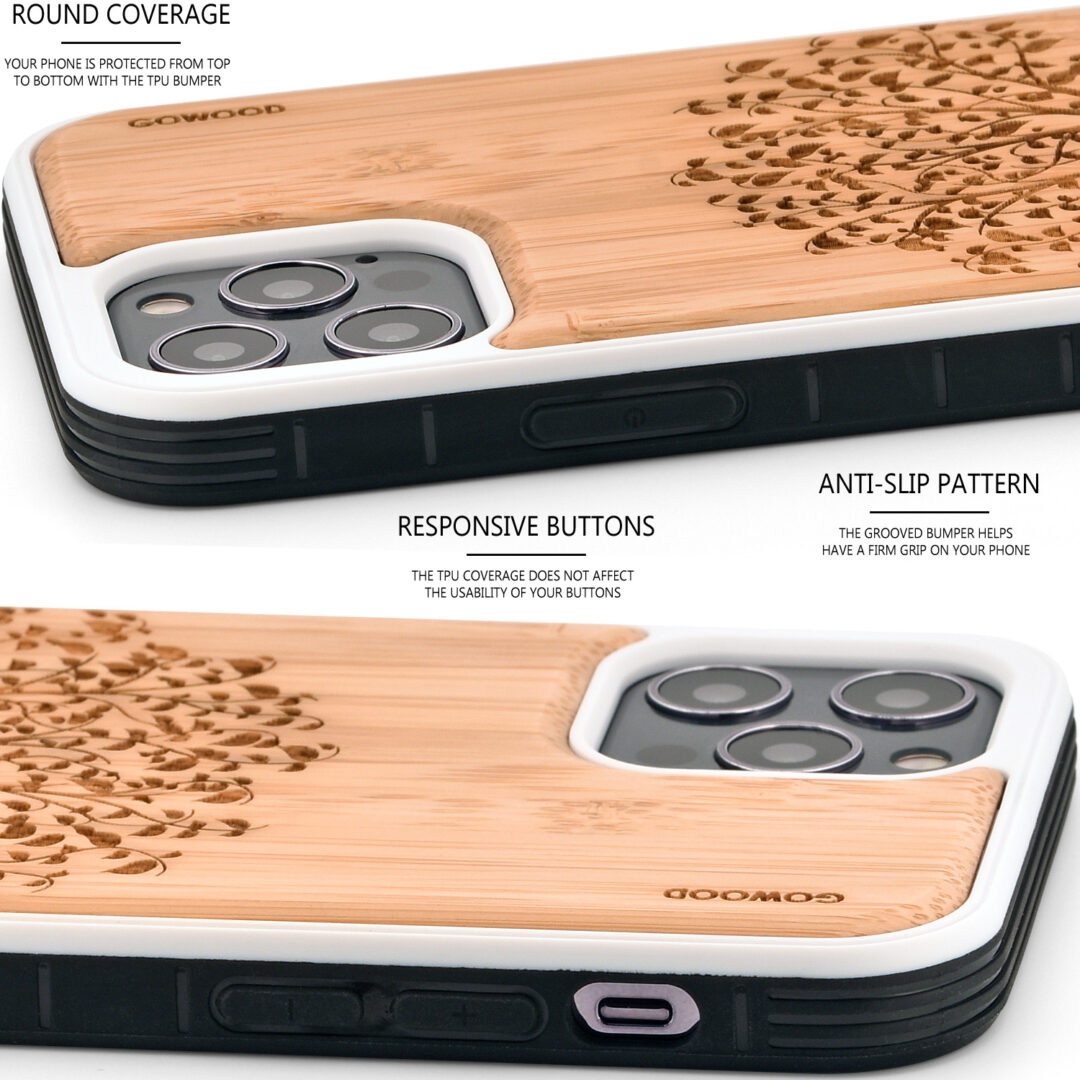 iPhone 12 and iPhone 12 Pro wood case with shock absorbing anti-slip TPU bumper, tree engraved real bamboo wood backside with polycarbonate layer inside