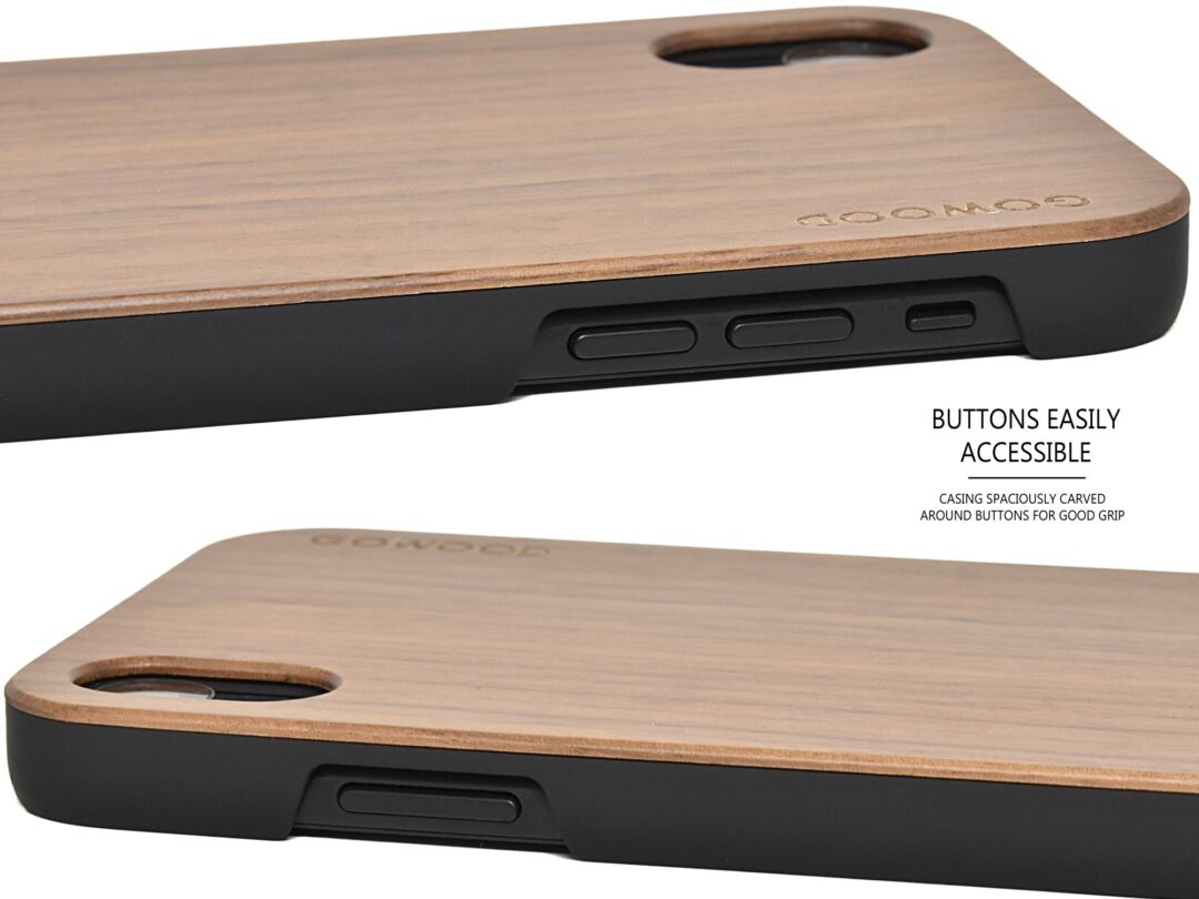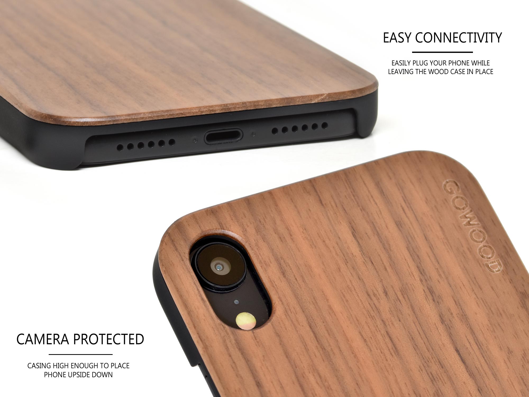 iPhone XR wood case with shock absorbing polycarbonate bumper and walnut backside