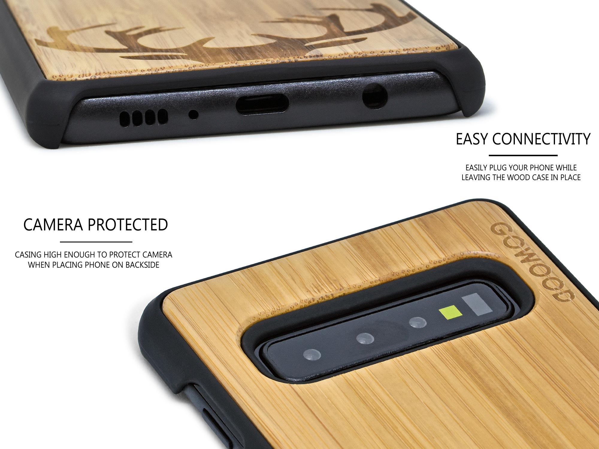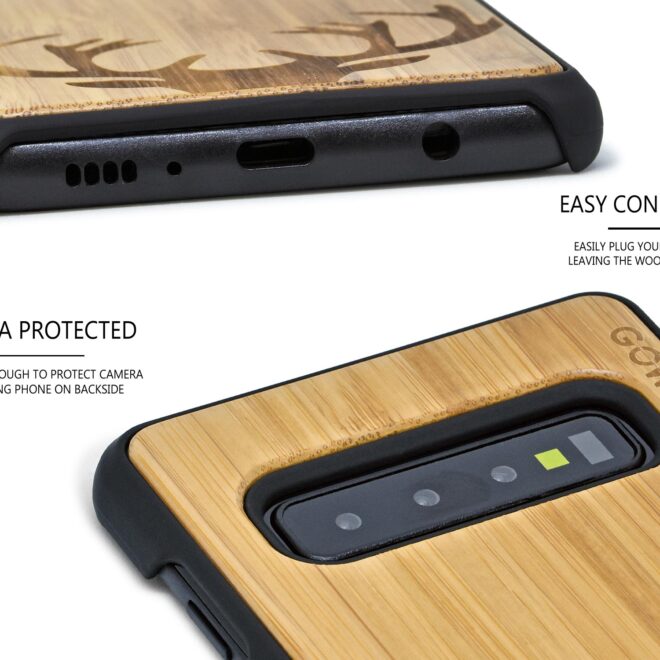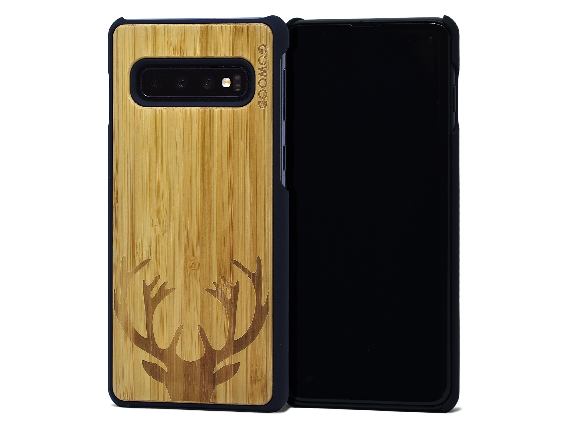 Samsung Galaxy S10 wood case with shock absorbing polycarbonate bumper and deer engraved bamboo backside