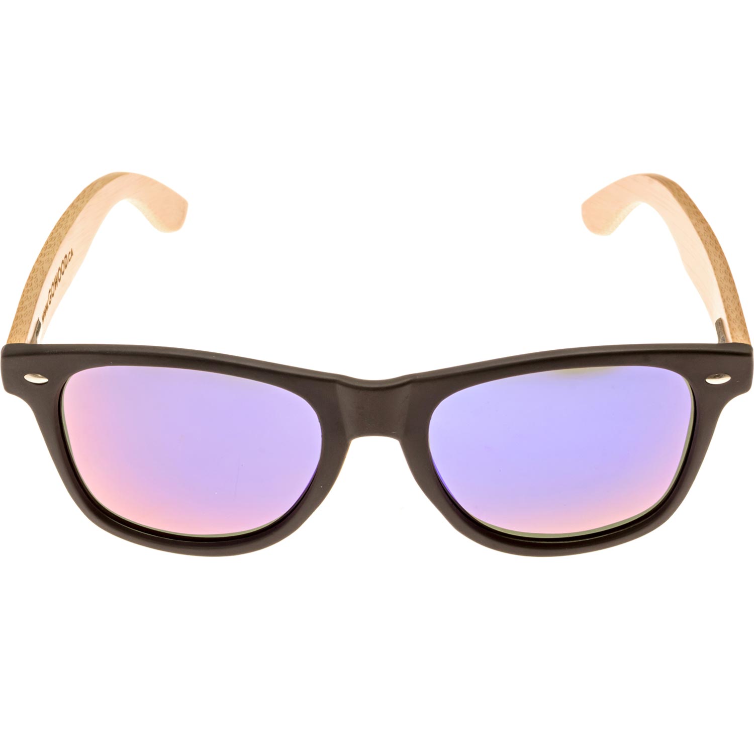 Bamboo wood classic style sunglasses with matte black acetate front frame and blue mirrored polarized lenses