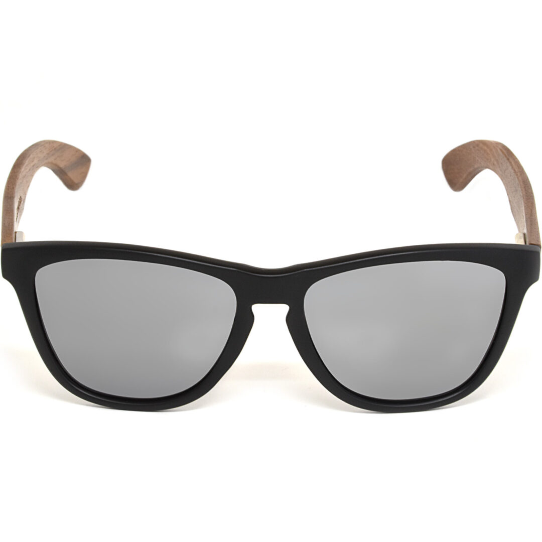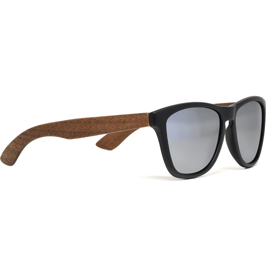 Classic walnut wood sunglasses with matte black acetate front and silver mirrored polarized lenses