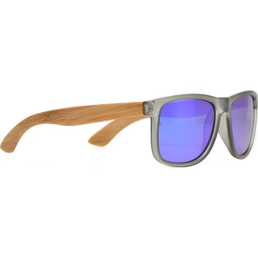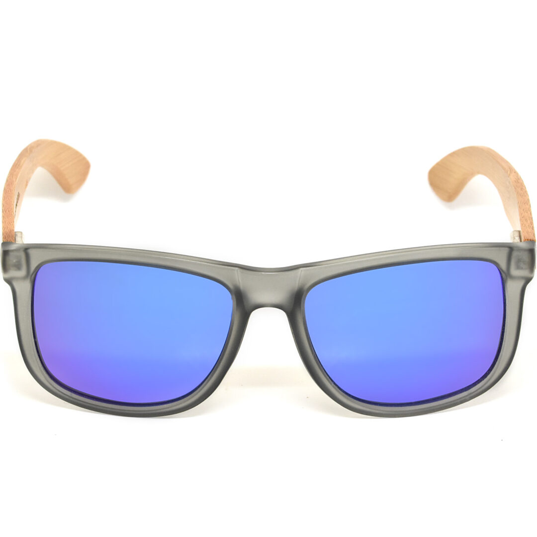 Square bamboo wood sunglasses with frosted grey front and blue mirrored polarized lenses