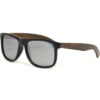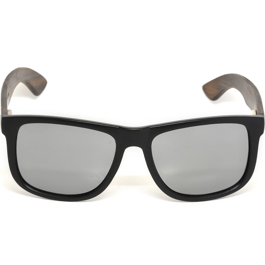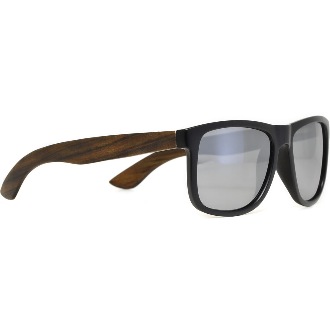 Square ebony wood sunglasses with matte black acetate front and silver mirrored polarized lenses