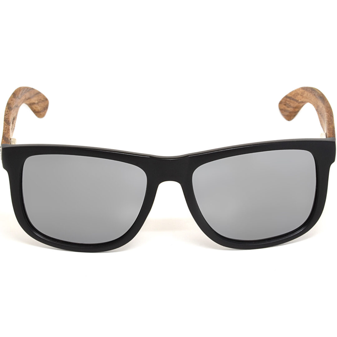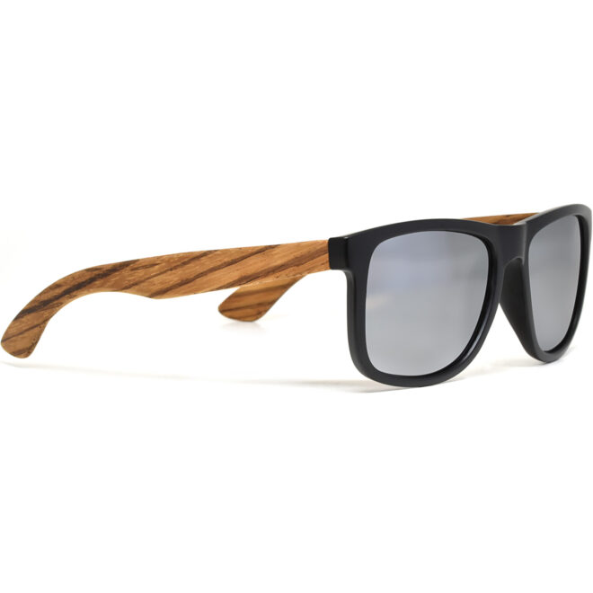 Square zebra wood sunglasses with matte black acetate front and silver mirrored polarized lenses