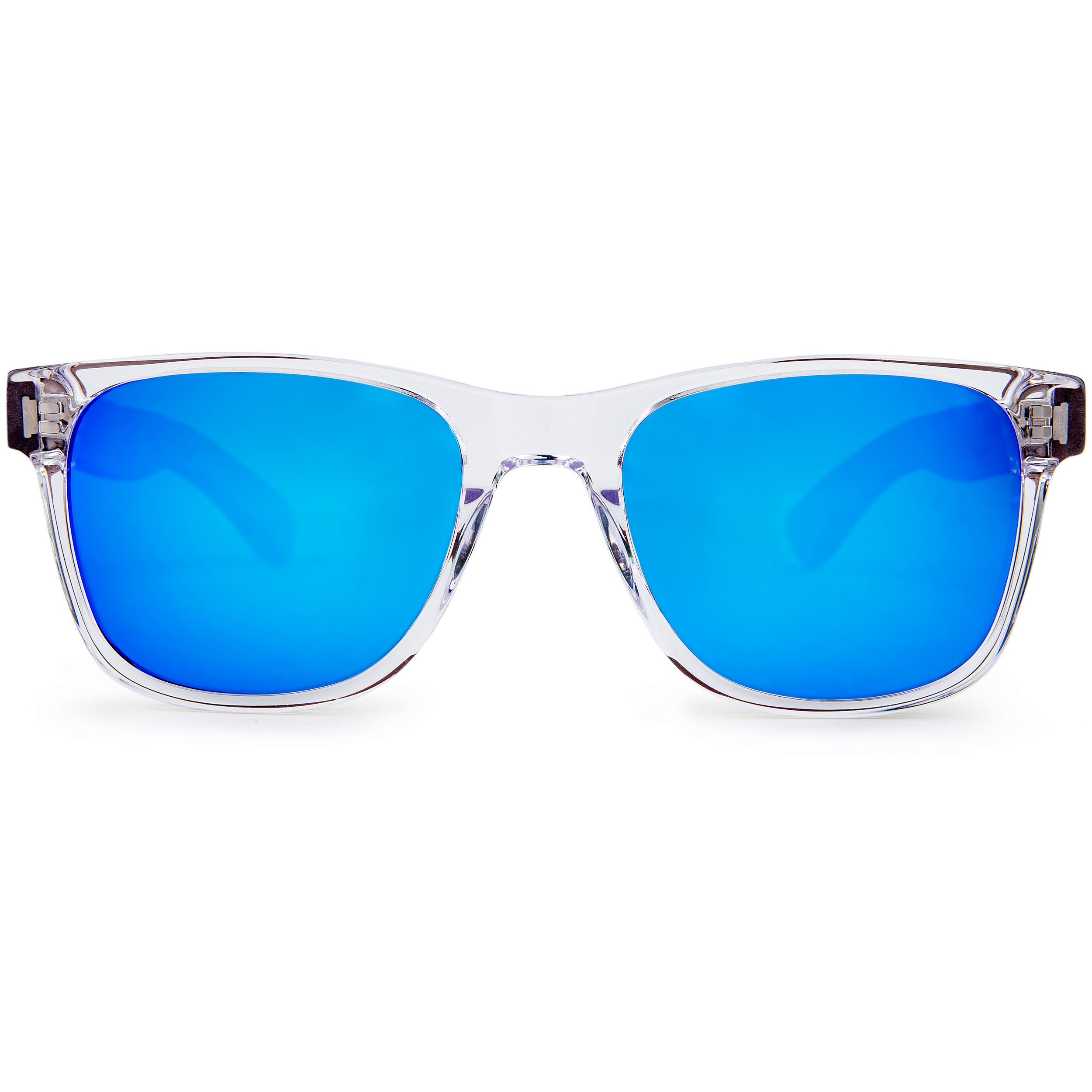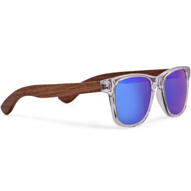 Walnut wood classic style sunglasses with clear frame and blue mirrored polarized lenses